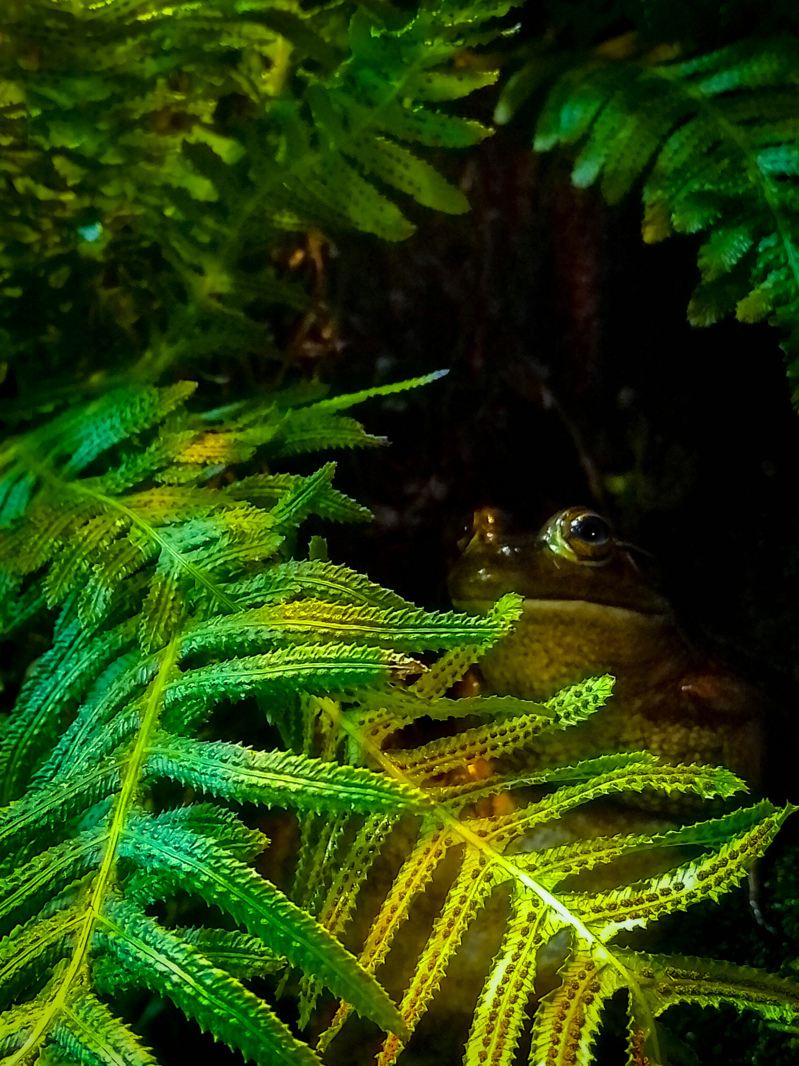 A frog chilling amongst ferns.